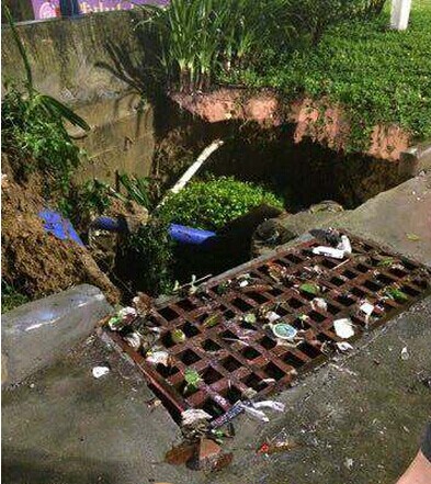 经过初步诊断是排水管距离地面5-6米左右,自来水管交汇的地方,被雨水冲损坏,导致路面下陷。