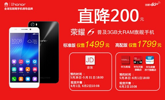 而眼前带给消费者最大的惊喜就是,荣耀6直降200元,标配版售价1499元,高配版售价1799元,以最直接的让利回馈消费者。1499元荣耀6可谓是手机行业最超值的4G旗舰机,因华为产品的超高品质、强悍的配置和贴心美观的软件,深受全国乃至全球海量消费者的喜爱,全网数百万用户好口碑,好评率高达97%,并在欧洲多国等多个海外国家的购物网站都荣登最畅销手机排行榜。劲爆的是荣耀6直降200元,并没有降低手机配置,依然保持3GB超大内存,相对市场中的2GB智能手机来说,运行更加流畅,完美保障手机在多程序运行中,依然能够享受到流畅手机体验。而此次劲爆的1499元售价,更是将主流名牌厂家3GB大内存的4G顶配旗舰智能手机售价推向另一个价格冰点,就如华为荣耀所描述的一样:普及3GB大RAM旗舰机!亲民的售价,能够让更多消费者享受到3GB大内存手机带来的极速使用体验。