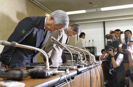 6月1日,日本年金机构理事长水岛藤一郎(左)在东京参加新闻发布会时鞠躬致歉。