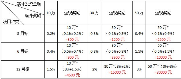 活动期间内,投资对应月份的项目金额满就送,千万元现金疯狂送!最高在原有的基础上额外奖励3%,真金白银的送绝不含糊,让人眼红。