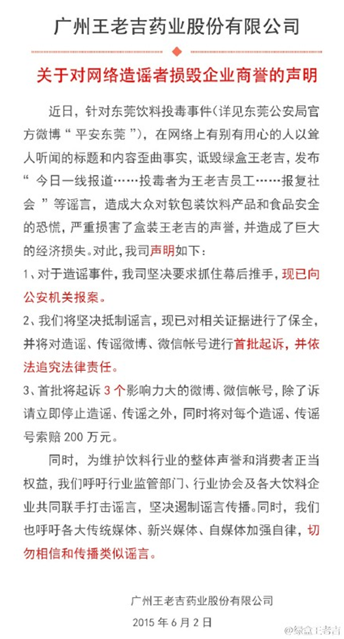 6月2日,王老吉药业发布声明,表示坚决要求抓住造谣事件的幕后推手,已向公安机关报案;同时启动司法程序,已对相关证据进行了保全,并依法追究造谣、传谣者的法律责任,首批将起诉3个影响力大的微博、微信帐号,除了诉请立即停止造谣、传谣之外,同时将对每个造谣、传谣号索赔200万元。