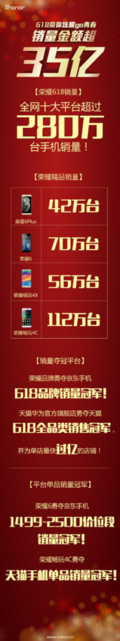 图:荣耀618全网销量超过280万台,荣耀6狂销70万台