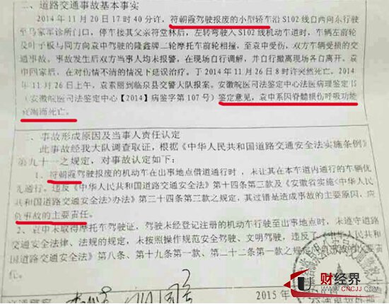 临泉县警方作出调查结论,则是另外一种说法。2015年4月10日,临泉县交警大队作出《道路交通事故责任认定书》:2014年12月20日17时40分许,符朝霞驾驶报废的小型轿车由西向东行驶至诊所门口,停车后接其父亲符堂林上车,车辆转弯驶入机动车道,与袁申驾驶的摩托车相撞,至袁申受伤、双方车辆受损。“事故发生后,双方当事人均未报警,在现场自行调节,并自行撤离现场各自离开。”袁申回家后,在对伤情不清的情况下延误治疗,于2014年11月26日8时许突然死亡。2014年11月26日上午,袁家人到临泉县交警大队报案。警方委托安徽皖医司法鉴定中心作出法医病理鉴定意见:袁申系脊髓挫伤呼吸衰竭死亡。交警大队认定,符朝霞负事故主要责任,袁申负次要责任。