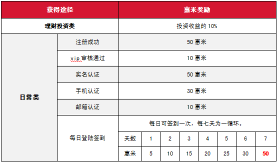 目前,惠米的获得途径共分为两大类:一、理财投资类,投资收益的10%作为惠米奖励;二、日常类,即通过日常任务获得惠米奖励,通过注册、vip审核、实名认证、手机认证、邮箱认证、每日登陆签到等方式,获得惠米奖励。