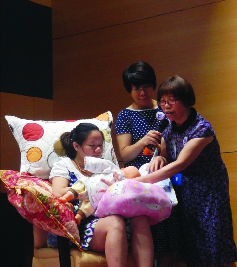 “将宝宝与自己紧紧地贴在一起,妈妈逗一逗,宝宝闻一闻,再找一找,这样我们的宝宝就能愉快地吃到奶。”在东莞市妇幼保健院的世界母乳周现场,全国著名的的助产专家余桂珍主任,手把手的教新手妈妈们,怎样用正确的姿势给宝宝喂奶,让现场的妈妈们边听边模仿。
