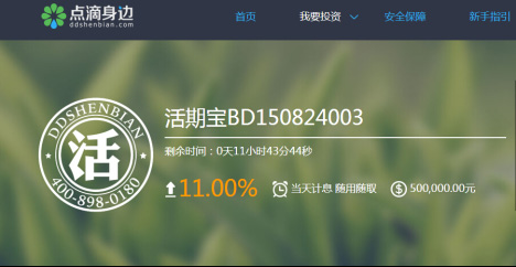 据了解,该平台主要有活期与定期两种产品。活期有活期宝,由于活期宝是该平台的新产品,所以在上线初期年利率高达11%,而且当日投资当日计息,随存随取,从充值到投资再到提现操作相当便捷。定期产品是点滴身边通过国内一线O2O平台合作研发的创新型产品,目前主要有滴滴宝、E洗车等项目,期限分3月、6月、12月不等,年利率为9%到14%之间,此外,点滴身边自建鹰眼大数据风控系统,通过与其他大数据征信平台合作并对接购物、生活缴费、社保、身份系统等大型网站,充分利用大数据技术优势,独创秒借产品,由于该产品借款额度均是小额借款且期限短,年利率更是高达18.4%,对于安全方面,点滴身边通过设置双重风险保证金、第三方机构承保的方式,充分保证投资者投资及回款安全。
