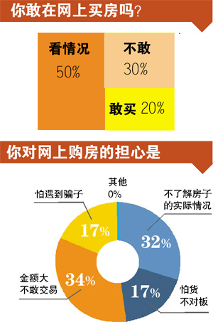 连日来,记者对297名网友进行问卷调查发现,虽然大部分网友都知道可以在网上买房,但是仅有20%的网友表示敢买,有79%的网友表示,担心原业主房产有遗留问题,不敢买。