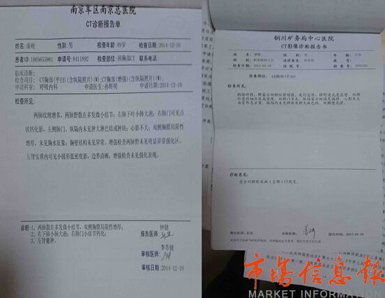 对于安康市疾控中心的检查结果,治疗过的矿工也均不认可。“2013年10月我在铜川矿物中心医院洗了一次肺就花了9500多元。”康峻说,他们7人每人光洗肺就花了9500—9700多元不等。但市疾控中心只查出了其中1人是尘肺病一期。“我分别在在安康矿物中心医院、南京军区南京总医院都检查出有尘肺病的症状,但市疾控中心却检查说没有”。