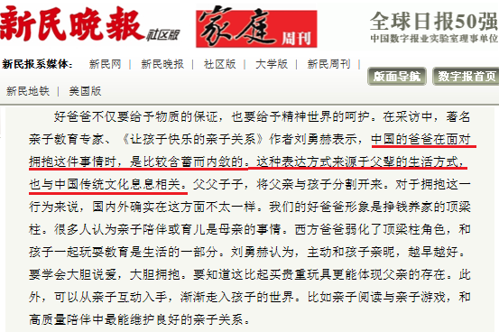 上海的新民晚报报道指出,中国的爸爸在面对拥抱这件事情时,是比较含蓄而内敛的。这种表达方式来源于父辈的生活方式,也与中国传统文化“男主外,女主内”的观念息息相关。