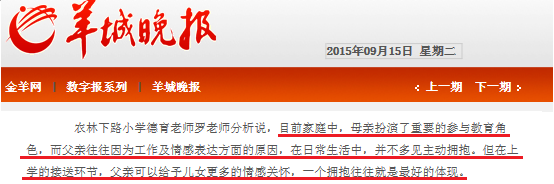 为了验明缺抱是否属实,北京晚报趁开学季派出记者蹲点学校,结果也发现中国爸爸不仅仅大量“缺席”,而且在面对因开学情绪不稳定的孩子时也不愿给出拥抱的“弱抱”事实。类似报道在广州也有出现,结果却不尽相同。