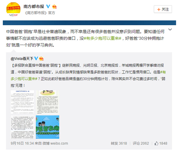 随着事件逐渐发酵,众多媒体发声告诫爸爸思考清楚:#有多少抱可以重来#?而@南方都市报则总结性的表示:中国爸爸“弱抱”现象早已是普遍存在的社会问题,只是在各方连番的报道下才最终得以慢慢浮现大众视野。