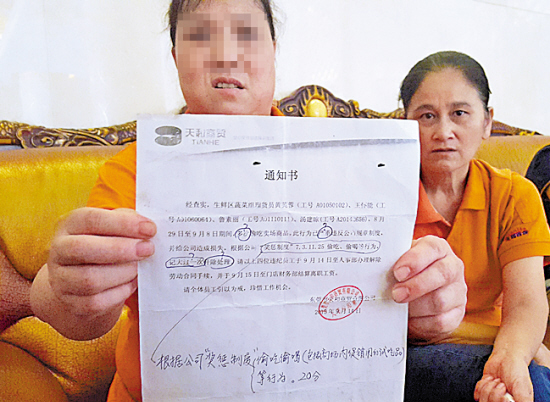次日下班,黄女士四人等到了处罚通知——被开除,罚款1000元,并扣发7月份工资。对于这一结果,她们四人无法接受,在随后的两天时间里,处罚分别改成“开除,罚款500元”和“开除,罚款200元”。黄女士对此很不服气,“我们每天早上4点半就起床赶着来上班,结果因为偷吃了超市不足几块钱的东西就被开除,实在太重了。况且为何只开除我们四人,被拍到的其他19人只罚款100到200元?如果开除我们就不能够罚款,并且应该补偿年薪。”