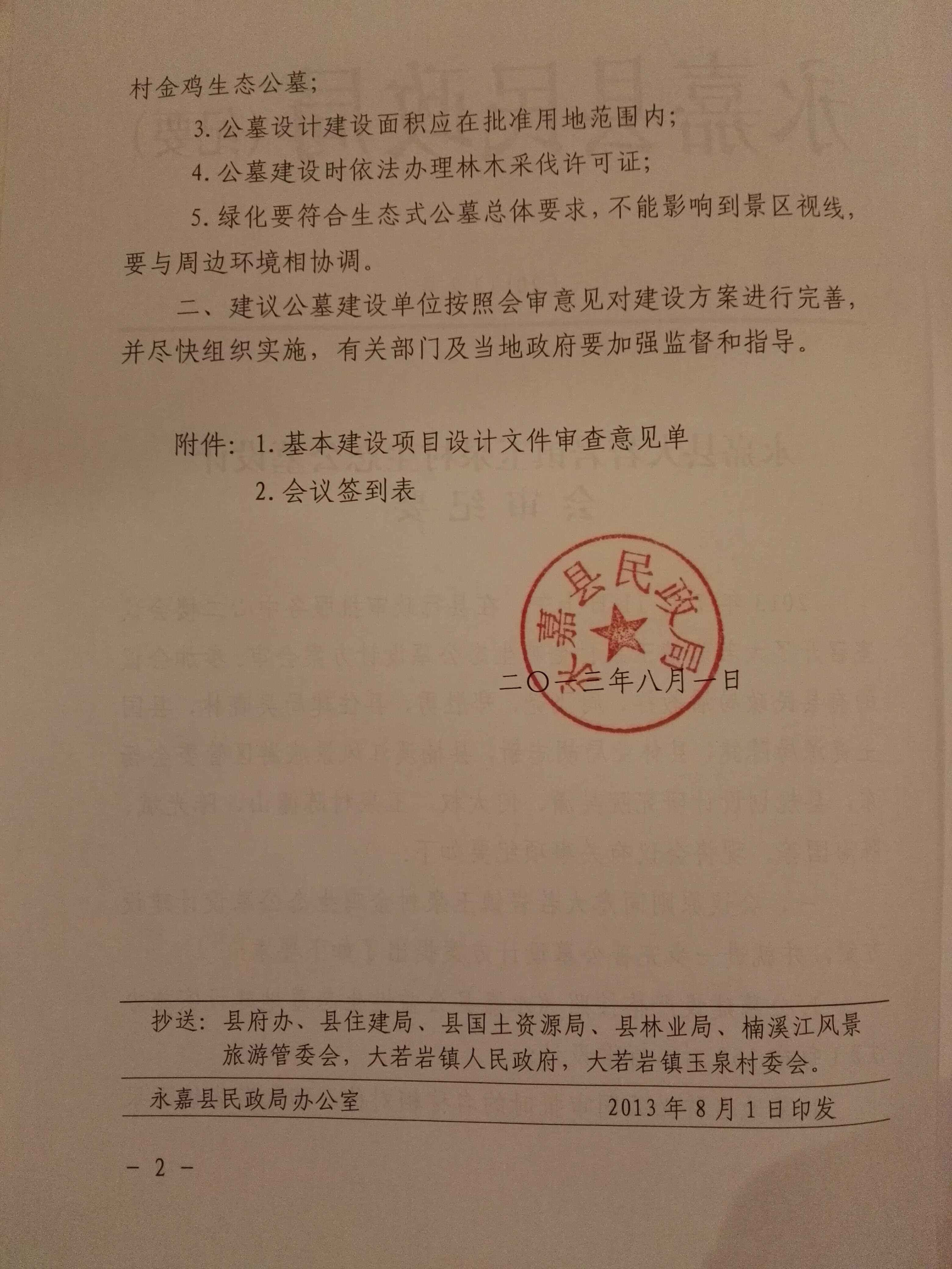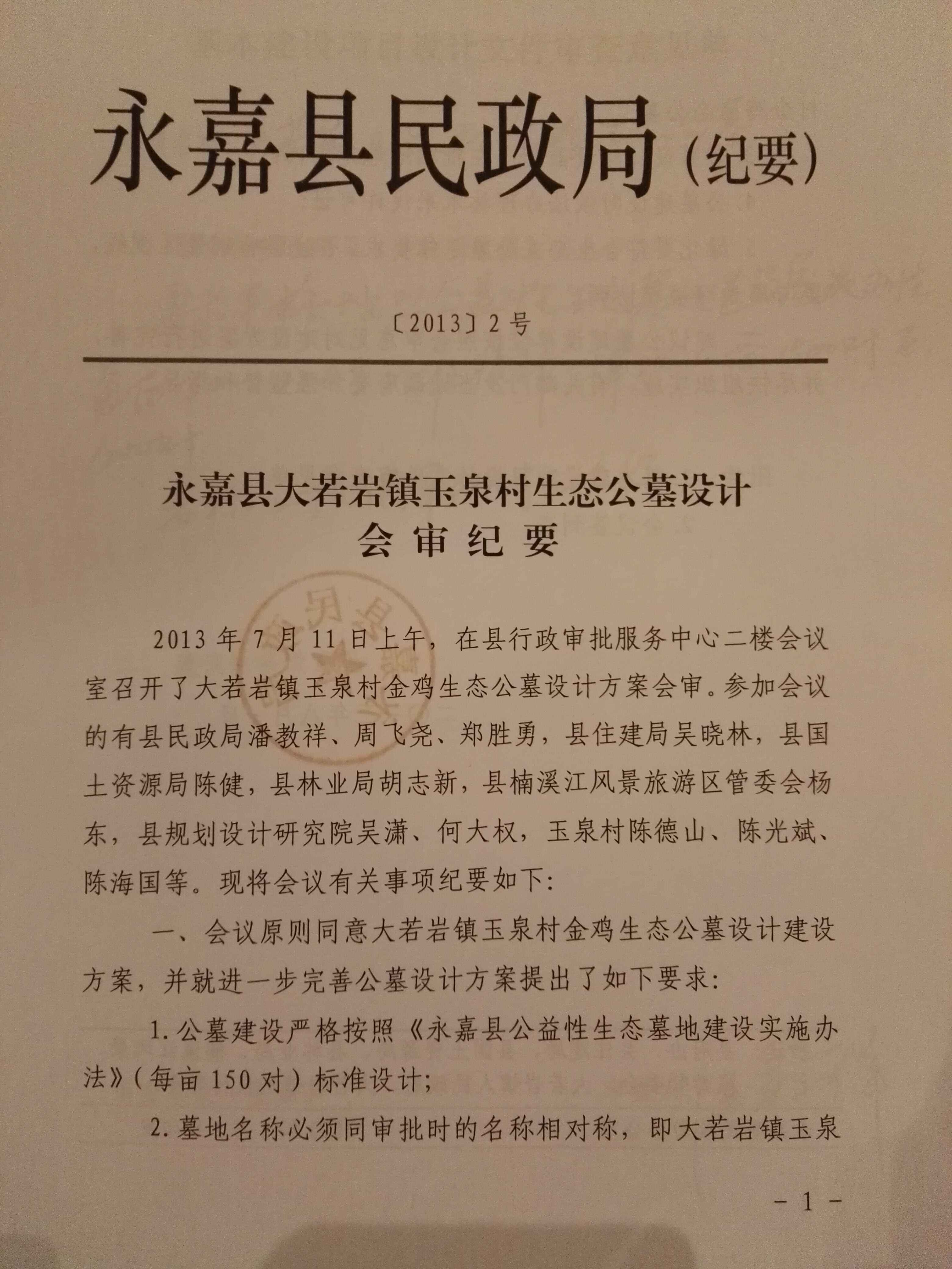 根据永嘉县民政局(2013)2号(纪要)文件,参加永嘉县大若岩镇玉泉村生态公墓会审的人员有:永嘉县民政局潘教祥、周飞尧、郑胜勇,永嘉县住建局吴晓林,永嘉县国土资源局陈健,永嘉县林业局胡志新,永嘉县楠溪江风景区旅游局管委会杨东,永嘉县规划设计研究院吴潇,何大权,玉泉村陈德山、陈光斌、陈海国等。