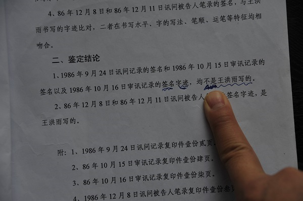 记者看到该司法鉴定书的结论是:1986年9月24日询问记录的签名和1986年10月15日询问记录的签名以及1986年10月16日询问记录的签名和笔迹,均不是王洪雨写的。