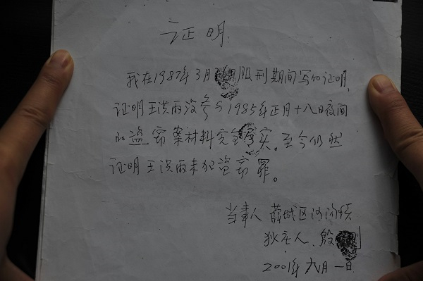 记者随后采访了微湖监狱的满某某,他说听说当年殷召刚给王洪雨出具了证明王洪雨未参与盗窃犯罪的《证明》。