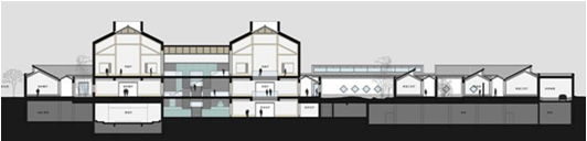 新馆建筑在高低错落的新馆建筑中,用颜色更为均匀的深灰色石材做屋面以及其下白色墙体周边石材的边饰,与白墙相配,清新雅洁,与苏州传统的城市肌理相融合,为粉墙黛瓦的江南建筑符号增加了新的诠释内涵。