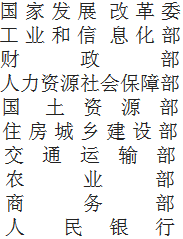 各省、自治区、直辖市发展改革委、工业和信息化主管部门、财政厅(局)、人力资源社会保障厅(局)、国土资源主管部门、住房城乡建设厅(委)、交通运输厅(委)、农业(农牧、农村经济)厅(委、局)、商务主管部门,中国人民银行上海总部、各分行、营业管理部、省会(首府)城市中心支行: