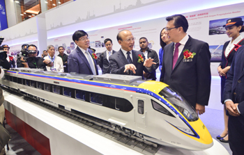 图为中国铁路总公司总工程师何华武(前排中)与马来西亚交通部长廖中莱(前排右一)观看由中国公司为马来西亚制造的火车模型。 张纹综/摄