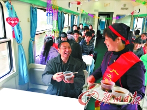 列车工作人员不仅表演节目,还邀请旅客猜灯谜、玩小游戏。餐车工作人员还为旅客派送热腾腾的汤圆,为大家送上一份甜蜜和温暖。(记者 董哲)(来源:广州日报)