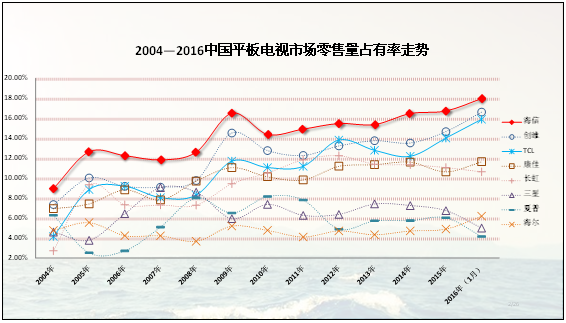 以海信为代表的中国品牌准确把握了CRT向平板转型的历史机遇,一举完成了市场强弱的大逆转,海信于2004年正式登顶第一。十几年来,海信等中国品牌的技术实力、产品竞争力不断增强、市场反应速度也超越外资品牌,从此掌握了中国彩电市场的主动权。