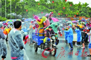 在东坑镇政府广场前的指定区域,人们你追我逐,尽情举“枪”鬼马对射,从而互洒“吉祥水”,现场一派喧嚣沸腾。“整个节日,我最期待的就是射水环节,感觉好刺激。”一边躲闪一边射水“还击”的年轻人如是说。(来源:广州日报)