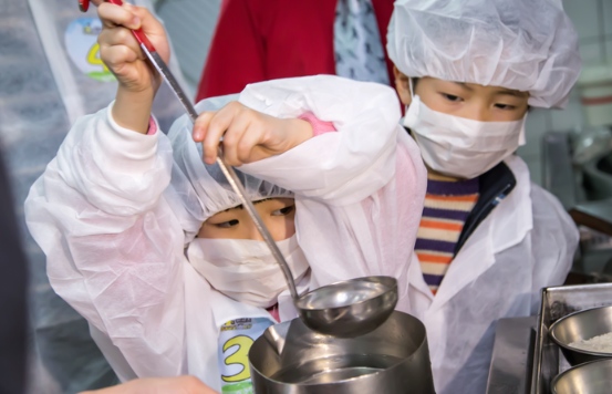这个环节还特意设置了小朋友体验环节,真功夫哥哥拿着装米的刻度杯对小朋友示范说,真功夫一份米饭的米、水配比是精确到克的喔。在后厨真功夫哥哥的协助指导下,小朋友亲手做了米饭和海带排骨汤。
