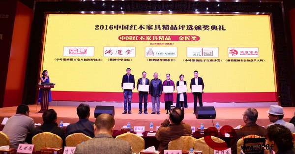 泰和园《松鹤延年圆茶台》在2016中国红木家具精品评选中斩获”金匠奖“(右一泰和园代表上台领奖)