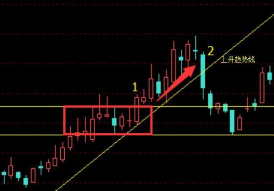 上图中,标1的位置就是介入的位置,当股价跌破上升趋势线,就是卖出的时机,如上图中标2的位置。
