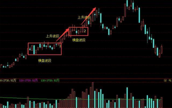 从图中可以看出,在股价节节攀升的过程中,出现过两个横盘波段,当股价突破横盘波段的上轨时,就是介入的时机,如图中标示1,2的位置。当股价突破之后,迎来了两个上升波段的行情。