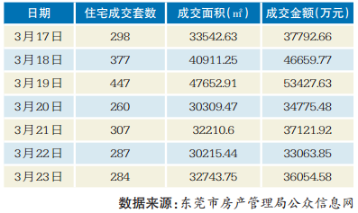 3月17日-3月23日,东莞市房产管理局公众信息网网上备案商品房3108套,成交面积284275.09平方米,成交金额336673.45万元。其中住宅备案成交2260套,成交面积247586.05平方米,成交金额278895.89万元,住宅成交均价约11264元/平方米。非住宅备案848套,成交面积36689.04平方米,成交金额57777.56万元。