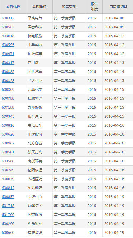 记者31日从上交所网站获悉,沪市上市公司2016年一季报披露时间表公布,平高电气首当其冲,将于4月8日公布。国睿科技紧随其后,4月9日公布一季报。杭电股份、中孚实业、恒源煤电将于4月12日公布。