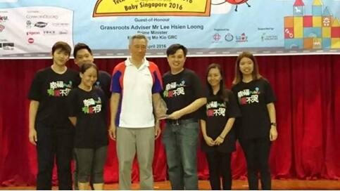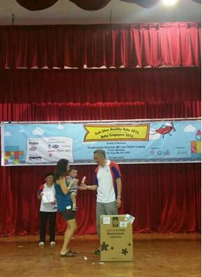 一位妈妈从新加坡总理李显龙先生手上接过一台Kiddy儿童安全座椅,她怀抱着宝宝,与百多位观众一起参加2016 Teck Ghee Healthy Baby Community Fair的活动,并幸运地被新加坡知名母婴连锁PUKU抽选为获奖人,把Kiddy安全座椅带回家。