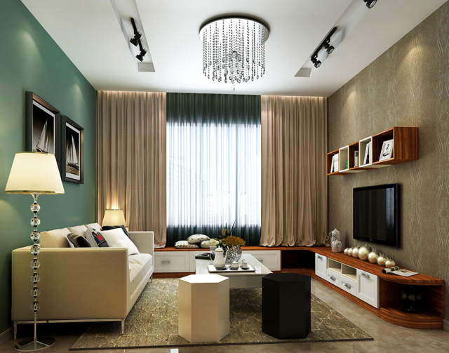 客厅的布置简洁利落,沙发、茶几、电视柜,造型时尚的吊柜和地柜组合成电视柜,为客厅增加了美的视觉。墙角落地窗的空间不可放过,加上地柜成美丽的飘窗,解决小沙发不够坐的难题,同时又解决了小户型不够地方收纳的难题。