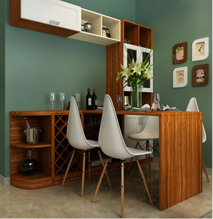 小户型双厅一体化设计,靠墙角落为用餐区,餐边柜设计侧U型,延伸组合出餐桌,简约吊柜布局才不会显得空间局促。餐桌可以是吧台也可以是办公桌,非常的实用,轻松扩容空间的可利用率。