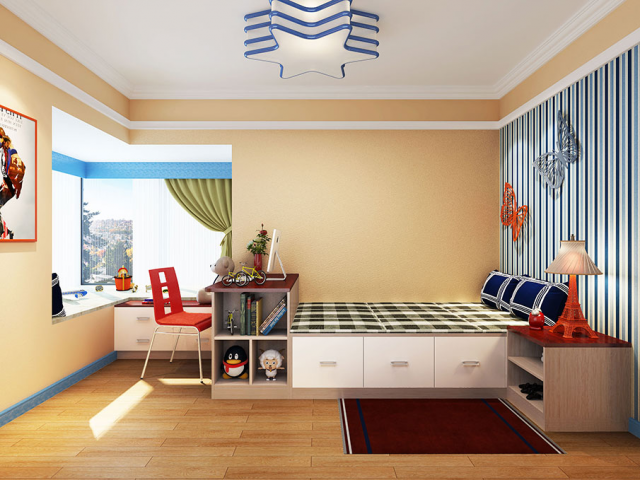 儿童房家具不仅要好看,更重要的是环保安全。家居100网对儿童房的家具板材全线采用零甲醛释放的禾香板,质量保证健康。儿童房布置要满足学习+睡眠+娱乐+收纳的功能,定制榻榻米床榻榻米床、书柜、书桌、床头柜一体化组合,轻松扩容空间,给孩子足够的学习成长天地。设计师能通过合理的规划,兼顾强大的收纳功能。