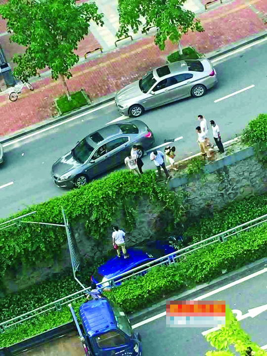 本田小车司机从车内爬出,站在车顶,最后是通过被撞弯的护栏爬回岸上。记者在现场看到,涉事的5系宝马车还是新车,没有上牌。车头有受损。一度以为车内还有被困人员,消防部门还出动消防车到场。