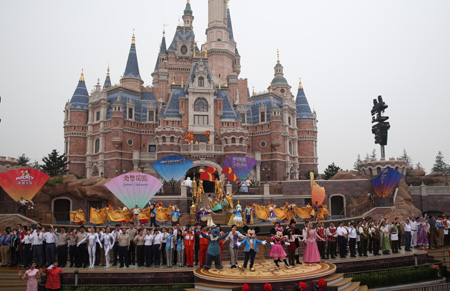 6月16日,迪士尼卡通人物以及演员们在开园仪式上载歌载舞。
