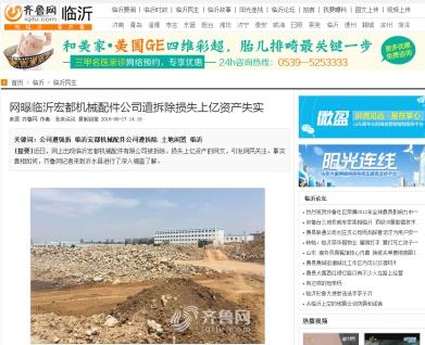 近日,齐鲁网以《网曝临沂宏都机械配件公司遭拆除损失上亿资产失实》为题,对山东沂水“2014.3.7”宏都机械强拆事件歪曲事实、评头论足,甚至对受害企业领导王广杰等一顿“狂轰乱炸”、诽谤中伤。该网作为山东省内主流新闻媒体,不遵守新闻职业道德和操守、胡言乱语、偏听偏信,在没有对躲避非法抓捕、逃亡在外的受害企业领导及正义知情人士作深入调查采访的情况下,捕风捉影、道听途说,甚至将沂水县委县政府杜撰编造的假文件证明材料拿来攻击驳斥临沂宏都机械配件有限公司和受害人,为虎作伥,奴才嘴脸十足!这是赤裸裸的“官谣”谎言,不值一驳,给媒体行业蒙羞,看后令人大倒胃口、愤懑作呕!
