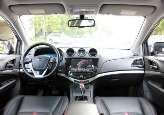 比亚迪S7的内饰以时尚和科技感并存为设计理念,遁形中控、鸥翼式的对称布局延续比亚迪家族式风格,黑色烤漆面板和全液晶仪表盘更突出车内的质感和科技感。