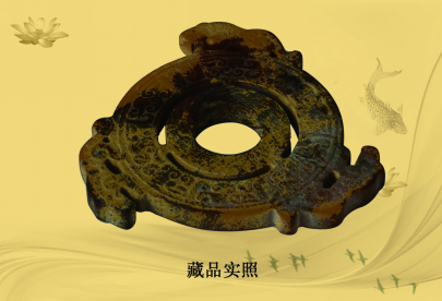 该藏品为高古玉玉璜,材质为黄玉,带黑褐色沁,通体扁平,圆形。两面纹饰相同,器身雕卷云纹和蝌蚪纹,有三只神兽盘踞在玉璜边上,活灵活现,气势宏伟。玉璜有两小孔,以备或悬或佩。此玉璜取材精良,整体雕琢,一气呵成,采用圆雕及浅浮雕工艺,精雕细琢,线条流畅,搭配完美,颇有艺术灵感。整器包浆古朴自然,器型高古,非常珍贵难得,具有很高的收藏价值。