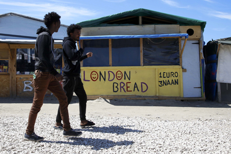 这是2016年6月24日,两名难民在法国加来的临时难民营内行走。