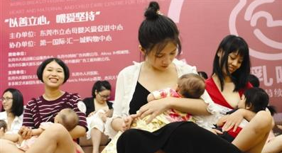 刚刚过去的周日,吴锦英领着一群母乳妈妈在东莞某商场开展了一场以“母乳快闪”为主题的公益活动,近30名妈妈怀抱着自己的宝宝,淡定地当众喂奶一分钟,以集体哺乳的行为艺术,呼吁社会关注母乳喂养。