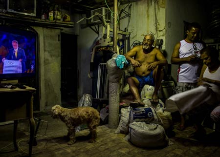 8月5日,居住在巴西里约孟盖拉贫民窟的阿道一家在天台观看奥运会开幕式。