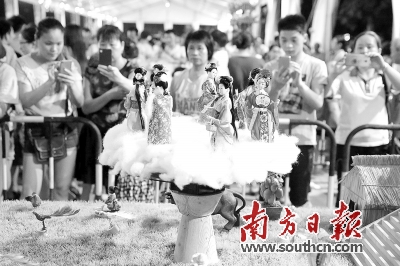 望牛墩文化广场上20多个七夕贡案受到了游客们的欢迎。这些贡案由望牛墩21个村的能工巧匠制作,贡案中的人物、草木、建筑虽然非常袖珍,但是惟妙惟肖,颇为有趣。(来源:南方日报)