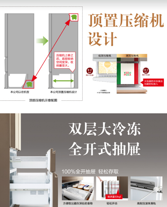 松下新款法式冰箱采用松下核心的顶置压缩机设计,将以往传统冰箱的底部压缩机转移到手难以触及的冷藏室顶部深处,大幅增加了使用频繁的冷冻室容量,使有效容积达到171L。同时冷冻室抽屉变深,大包装的速冻食品也能轻松放入。采用高耐压滚珠式滑轨,承重达到50kg以上!放置一次集中采购的大量食材也能轻松开合。全开式设计,藏在抽屉深处的食物也能轻松拿取。