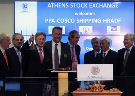 中国远洋海运集团(简称中远海运)10日与希腊共和国发展基金签署《比雷埃夫斯港(简称比港)港务局多数股权交易完成备忘录》,这标志该集团下属的中远海运(香港)正式成为比港港务局的控股股东,开始接管比港港务局的经营。随后,中远海运董事、总经理万敏在雅典股票交易所鸣响了当天的开市铃,这象征中远海运正式成为比港港务局控股股东。(来源: 经济参考报)