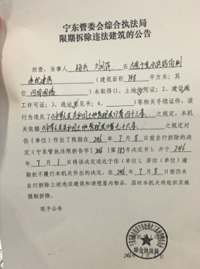 2016年6月15日,宁东管委会执法大队对杨兵下达了《限期拆除告知书》「171号」,以违反《规划法》的名义要求拆除营业平房。6月28日,在没有撤销前面告知书的情况下又以违反《土地管理法》的名义下达了《责令改正通知》(宁东管执法责改字2016 ,26号),这次面积不仅涉及营业房又追加了院内围墙。7月1日,又再次下发《限期拆除告知书》『第183号』,被执行者的姓名不光有杨兵还新增加了刘凤萍,同时下发的还有《宁东管委会综合执法局限期拆除违法建筑公告》。8月8日,杨兵再次收到一份《责令改通知书》『2016』责改宁第002号文件,而这一次发件方又从宁东管委会变成了宁东镇镇政府。8月9日宁东镇政府又下发了《限期拆除决定书》,而这次援引的条例又变为《村庄和集镇建设管理条例》和《城乡规划法》。8月10日,宁东镇镇政府出具的《宁东镇人民政府限期拆除违法建筑的公告》,8月16日再次签署一张《限期拆除违法建筑的公告》,同时还有一份《限期拆除决定书》。