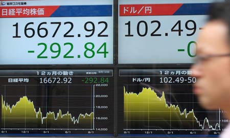 图为当日在日本东京,一名男子从电子股指显示牌前走过。