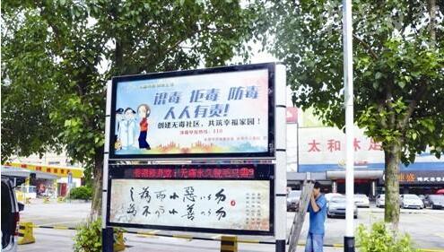 党报阅报栏点位覆盖面广,城区和镇街都有,分布在道路两旁、社区广场、学校等人流密集的地段,效果直观,冲击力强。因此,市禁毒委、市公安局选择党报阅报栏投放禁毒主题公益宣传画。