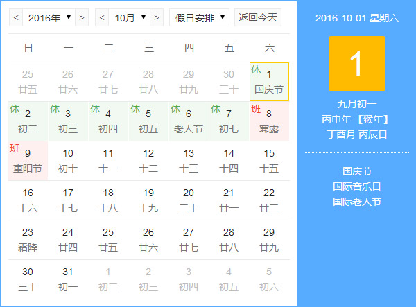 10月1日至7日放假调休,共7天。10月8日(星期六)、10月9日(星期日)上班。